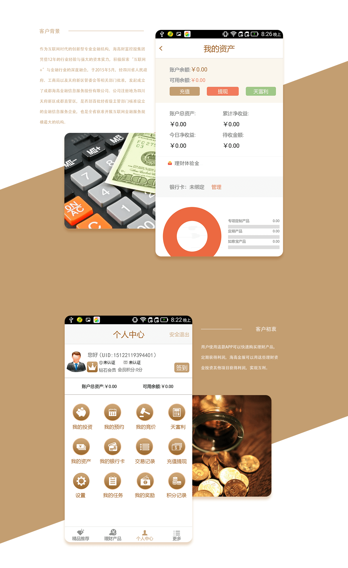 用户使用这款APP可以快速购买理财产品,定期获得利润,海高金服可以用这些理财资金投资其他项目获得利润,实现互利;用户购买理财产品后,可以中途转让,也可以中途卖回给平台,客户也可以按时间查询近期的收益,查看平台发送的理财软文,提升客户对平台的信任度,提供客户对理财产品的认识水平和接受度。