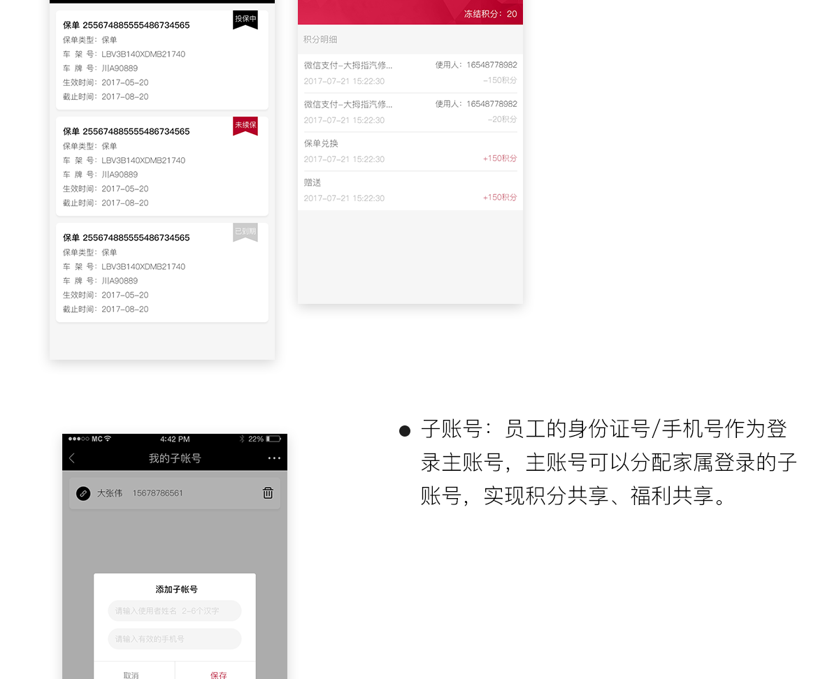 4、员工的身份证号或手机号作为登录主账号,主账号可分配家属登录的子账号,实现积分共享、福利共享