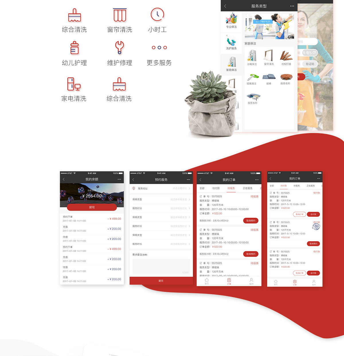 用户端:用户可快捷选择某项服务,以及合适的服务人员进行下单;线上支付服务可选择单次服务和周期服务,并且用户选择在平台充值后可享受服务优惠政策。