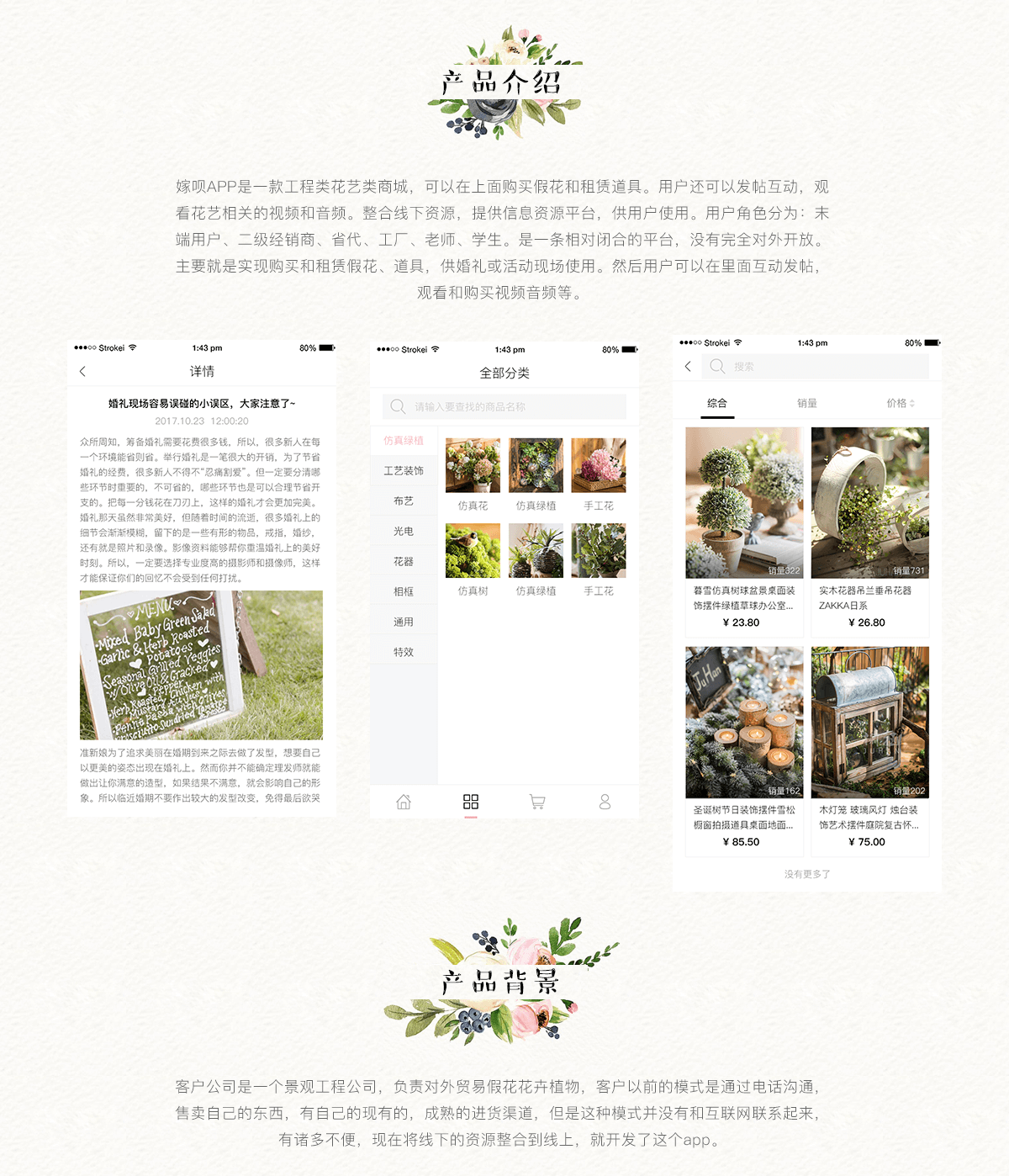 花艺租赁app是一款工程类花艺类商城,用户可购买假花和租赁道具。用户还可以发帖互动,观看花艺相关的视频和音频。整合线下资源,提供信息资源平台,供用户使用。用户角色分为:用户、二级经销商、省代、工厂、老师、学生。是一条相对闭合的平台,没有完全对外开放。主要就是实现购买和租赁假花、道具,供婚礼或活动现场使用。然后用户可以在里面互动发帖,观看和购买视频音频等。