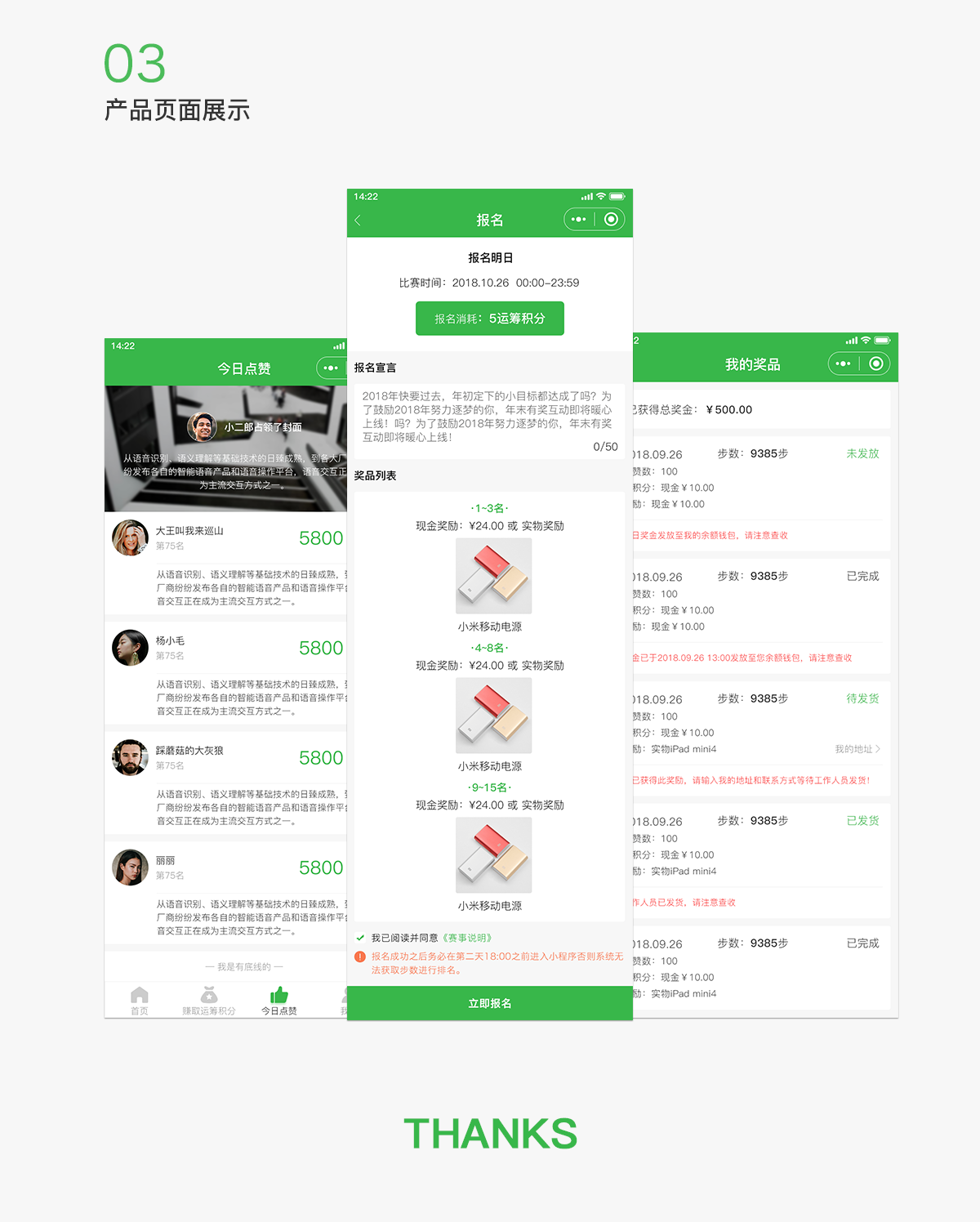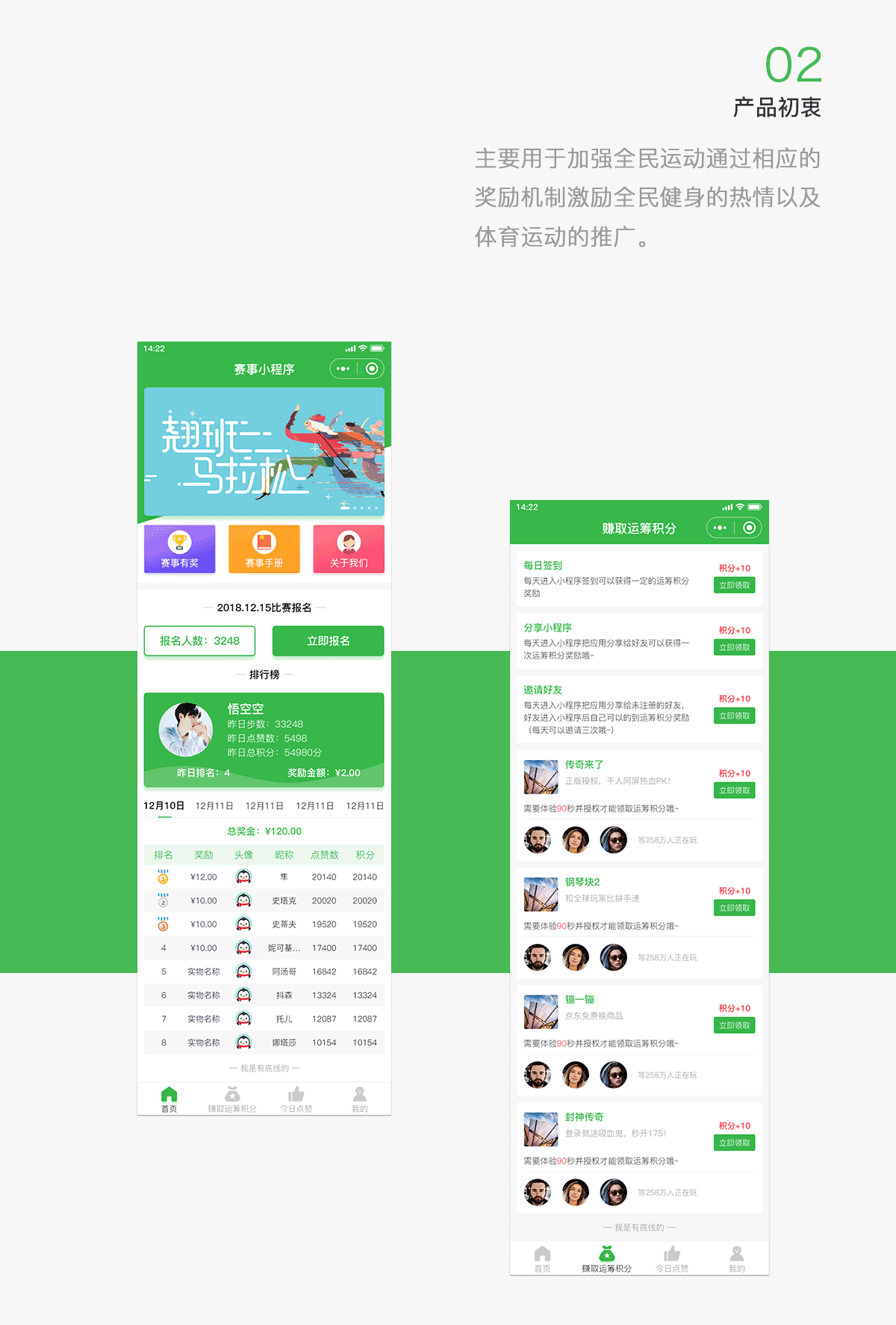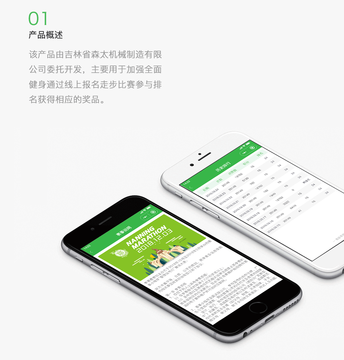 该产品由吉林省某机械制造有限公司委托开发,主要用于加强全面健身通过线上报名走步比赛参与排名获得相应的奖品