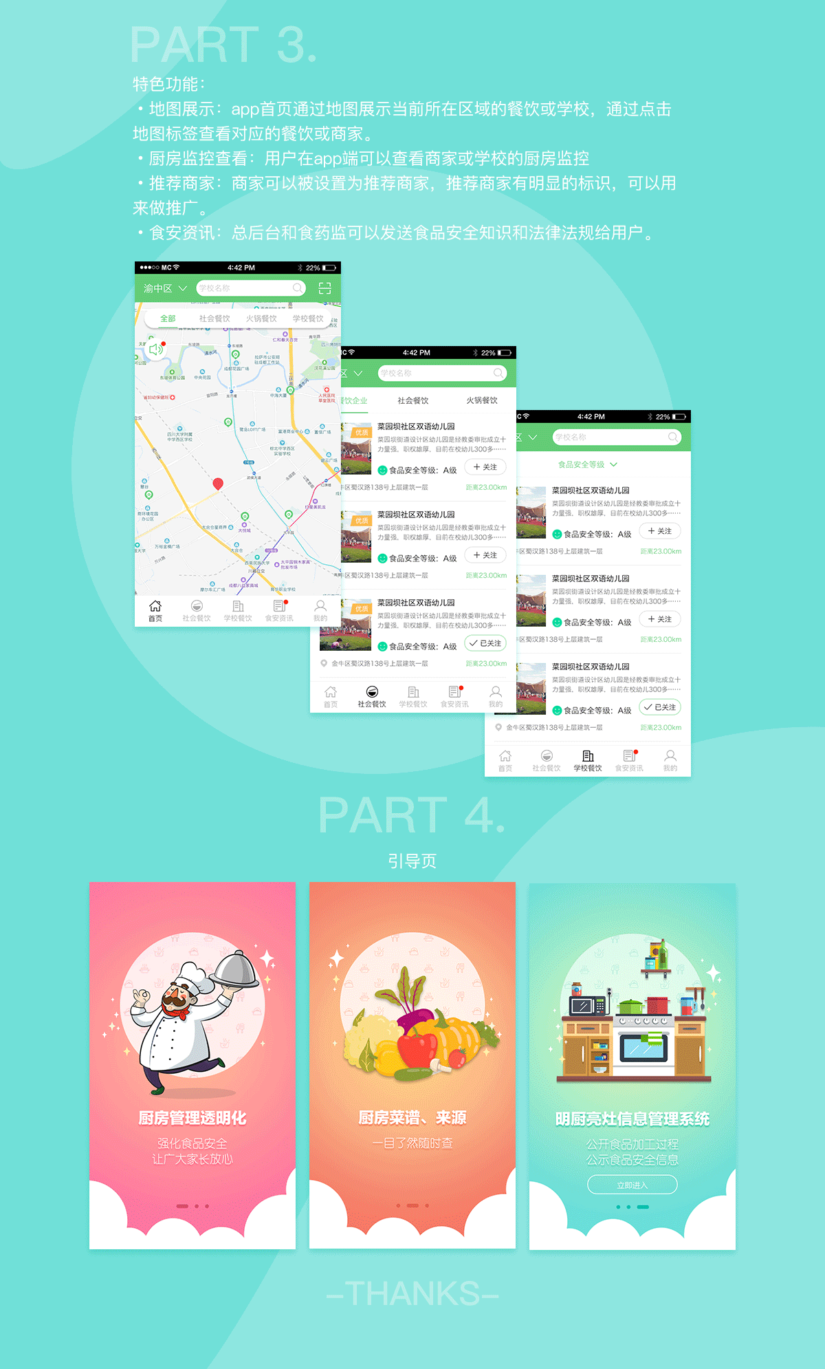 地图展示:app首页通过地图展示当前所在区域的餐饮或学校,通过点击地图标签查看对应的餐饮或商家。