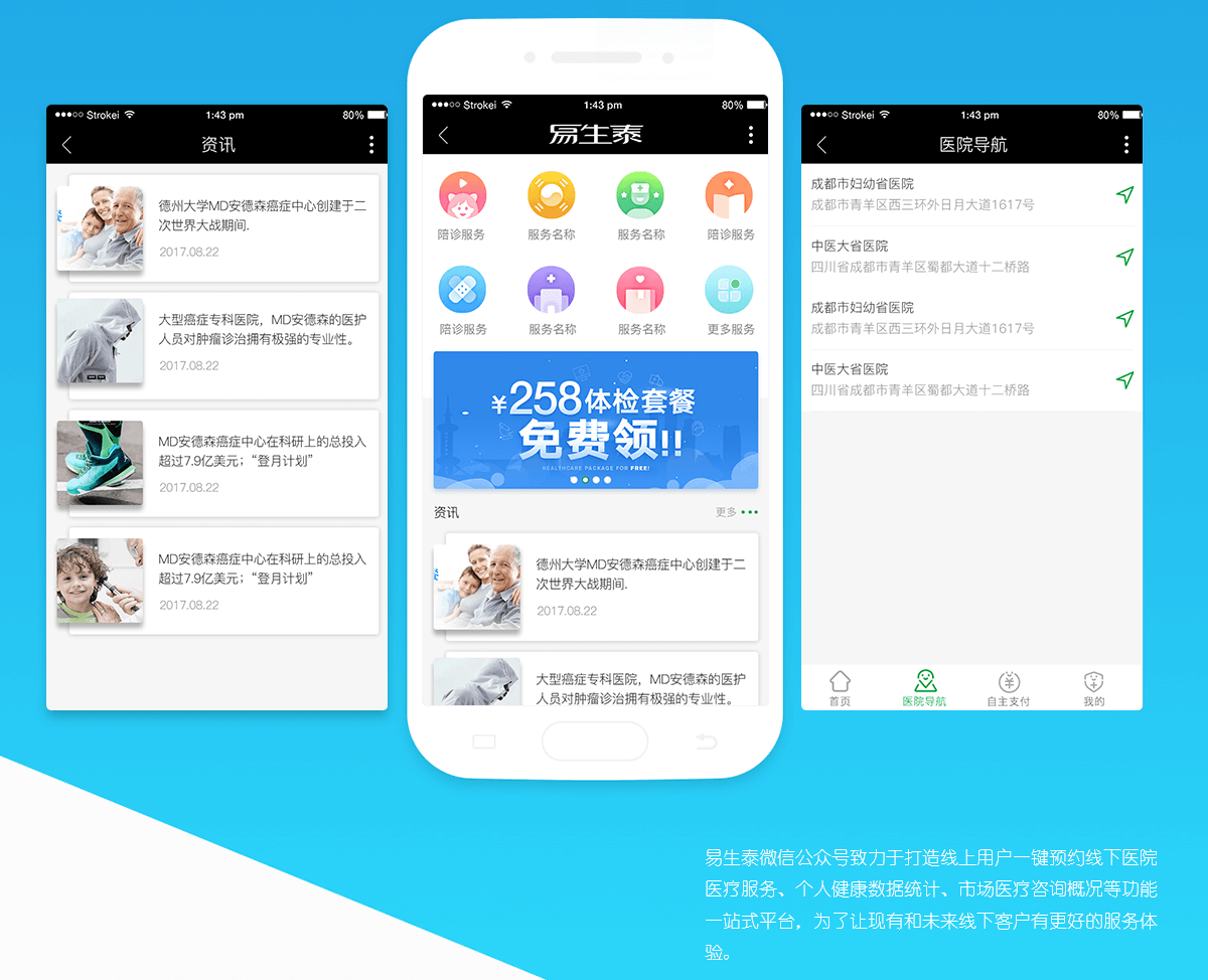 易生泰微信公众号致力于打造线上用户一键预约线下医院医疗服务、个人健康数据统计、市场医疗咨询概况等功能一站式平台,为了让现有和未来线下客户有更好的服务体验。