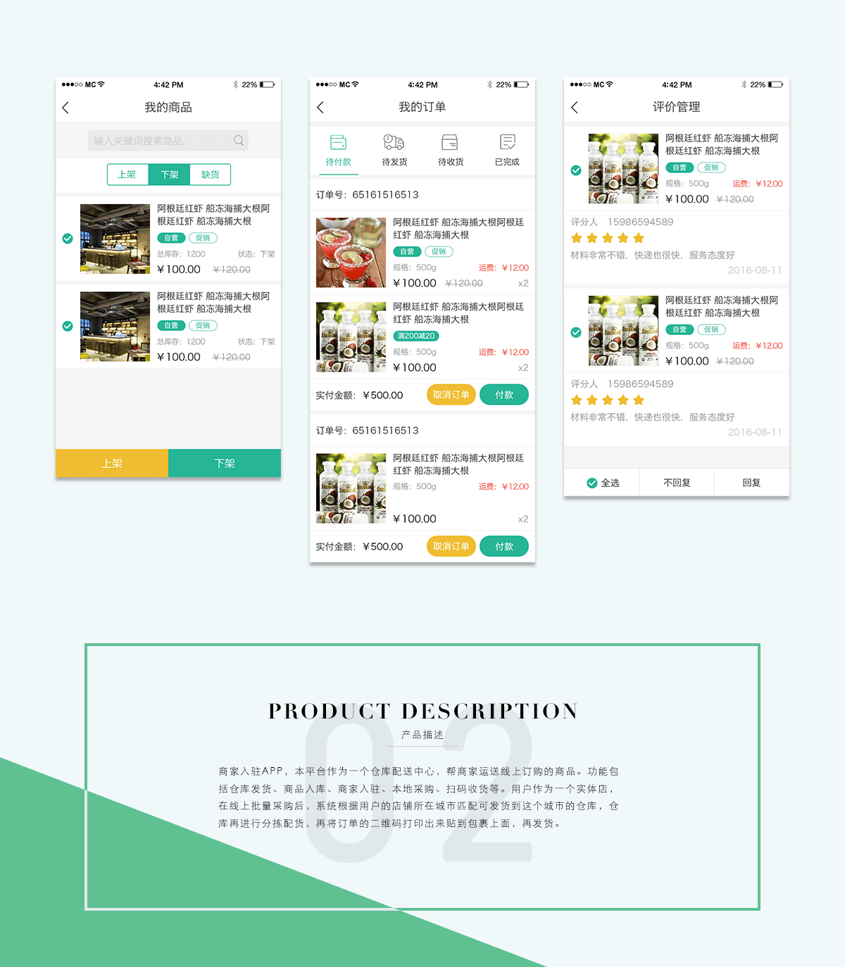 商家入驻APP,本平台作为一个仓库配送中心,帮商家运送线上订购的商品。功能包括仓库发货、商品入库、商家入驻、本地采购、扫码收货等。用户作为一个实体店,在线上批量采购后,系统根据用户的店铺所在城市匹配可发货到这个城市的仓库,仓库再进行分拣配货,再将订单的二维码打印出来贴到包裹上面,再发货。