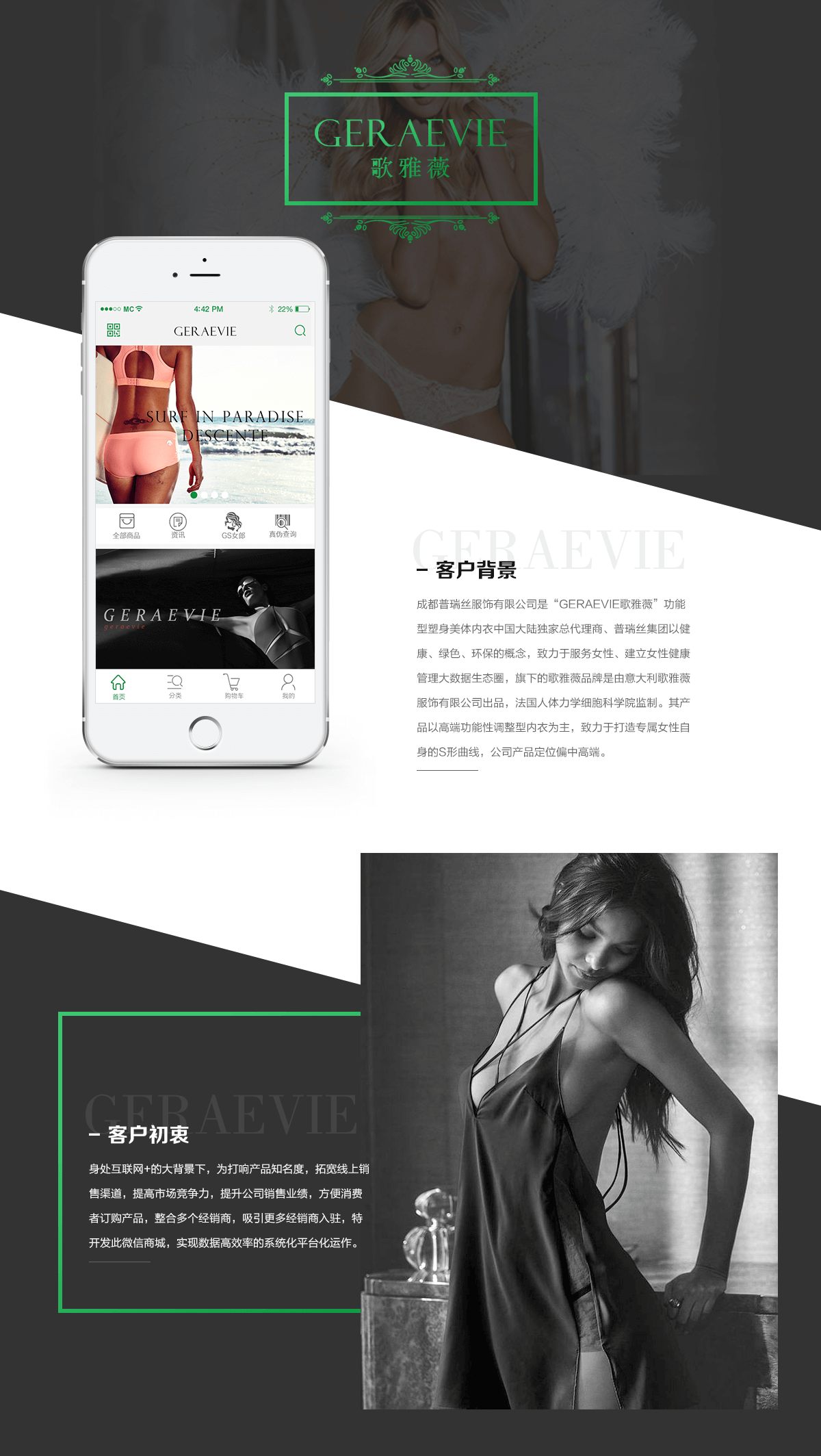 “普瑞丝商城”是为高端消费人群服务的高端女性内衣的商城平台,能够实现下单,送货,评价等一系列的网络商城功能。商城系统还带有强大的分销系统,可实现众多经销商的分红系统自动化计算,省去人工计算的繁琐。