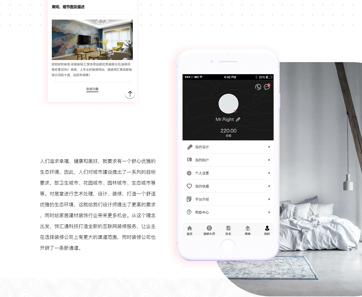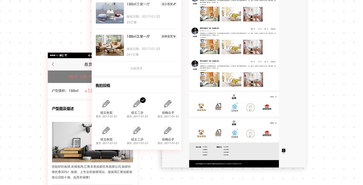 找设计/找装修: 户可以查找所有在平台注册的设计师/装修工人/设计师,对感兴趣的服务商可通过QQ、微信或电话交流,双方洽谈满意后,可在平台选择某个服务商下单,输入订单金额,下单成功后开始合作。此类型的线上合作方式,饰汇通平台建立有效的担保,为业主的家装提供更有保障的服务。