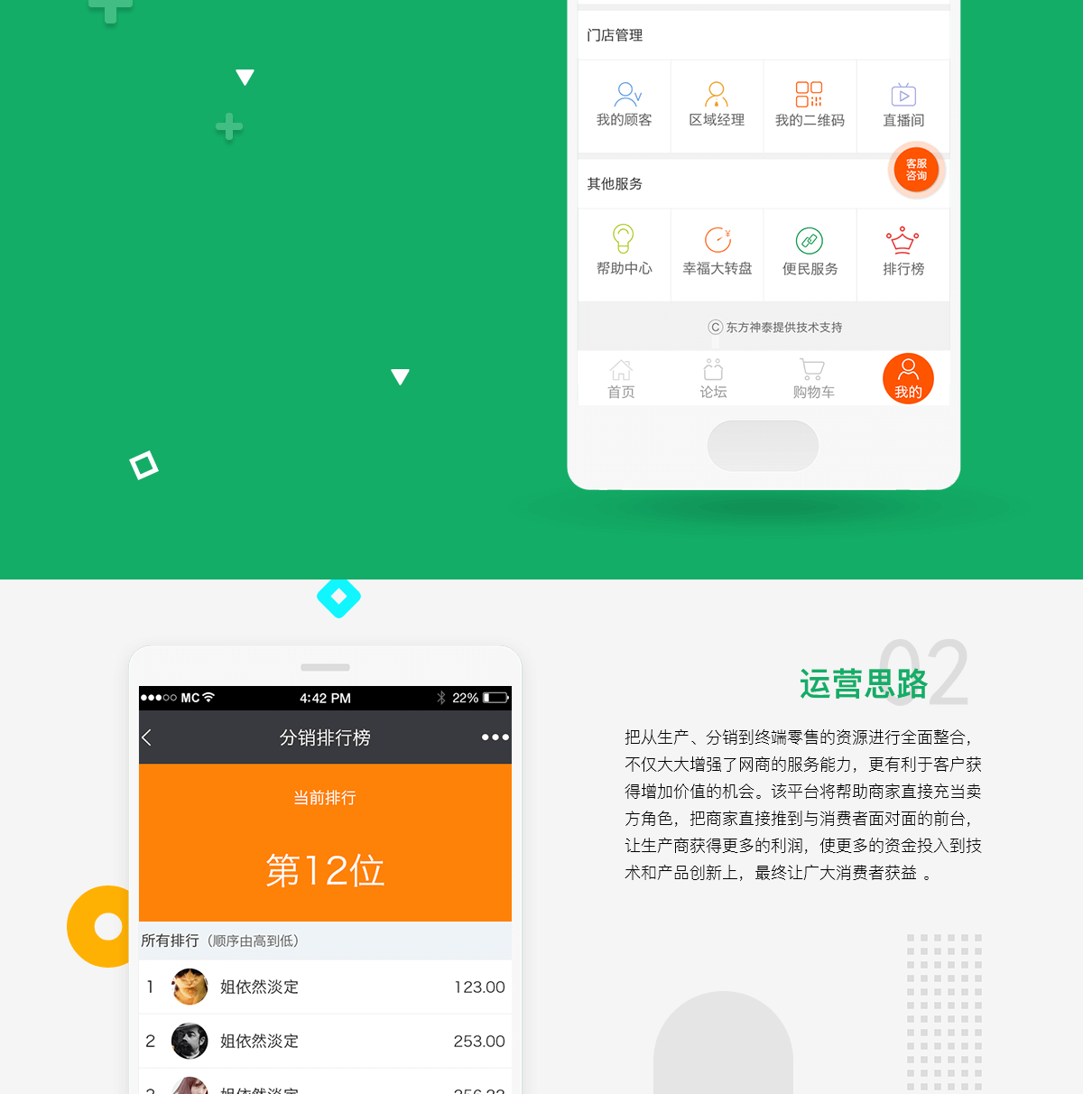 成都公众号健康商城是以“B2B2C“为商业模式的线上综合性健康商城,商城通过统一的经营管理对商品和服务、消费终端同时进行整合,定制、监督、检验产品,为消费者提供高品质健康产品。商城通过代理产品是销售渠道建立推广团队,通过用户自身的推广宣传自己的产品,同时利用线下门店优势为平台宣传造势。平台通过微信这一传播渠道做商城活动,引流用户线下消费体验。