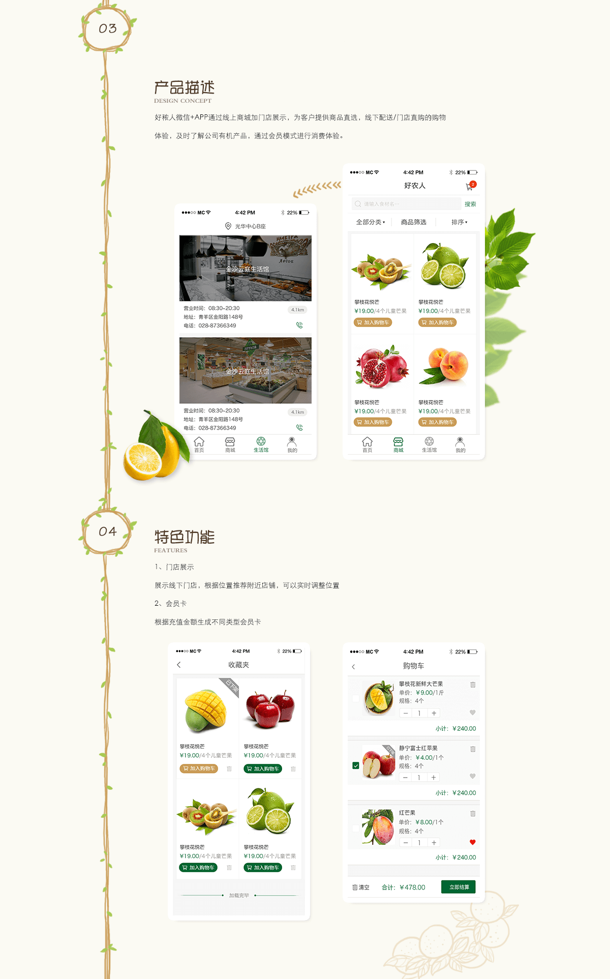 好秾人微信+APP通过线上商城加门店展示,为客户提供商品直选,线下配送门店直购的购物体验,及时了解公司有机产品,通过会员模式进行消费体验。