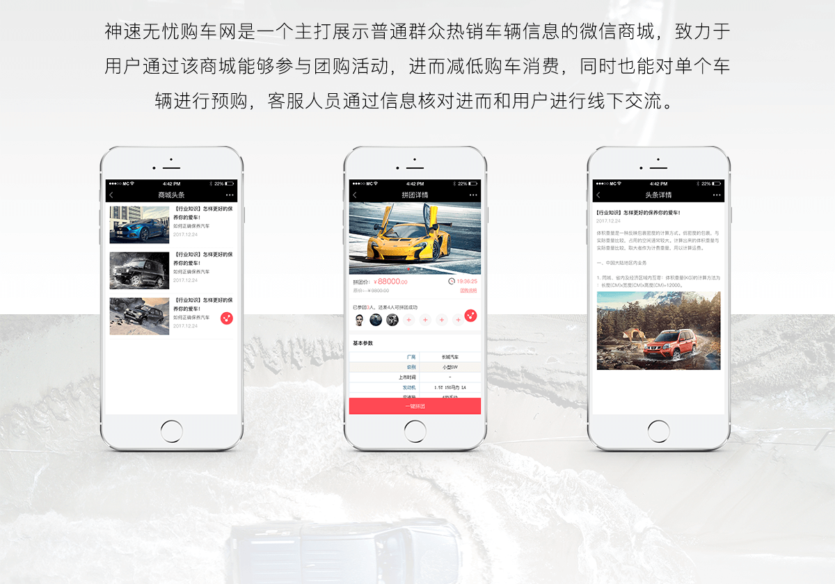 神速无忧购车网是一个主打展示普通群众热销车辆信息的微信商城,致力于用户通过该商城能够参与团购活动,进而减低购车消费,同时也能对单个车辆进行预购,客服人员通过信息核对进而和用户进行线下交流。