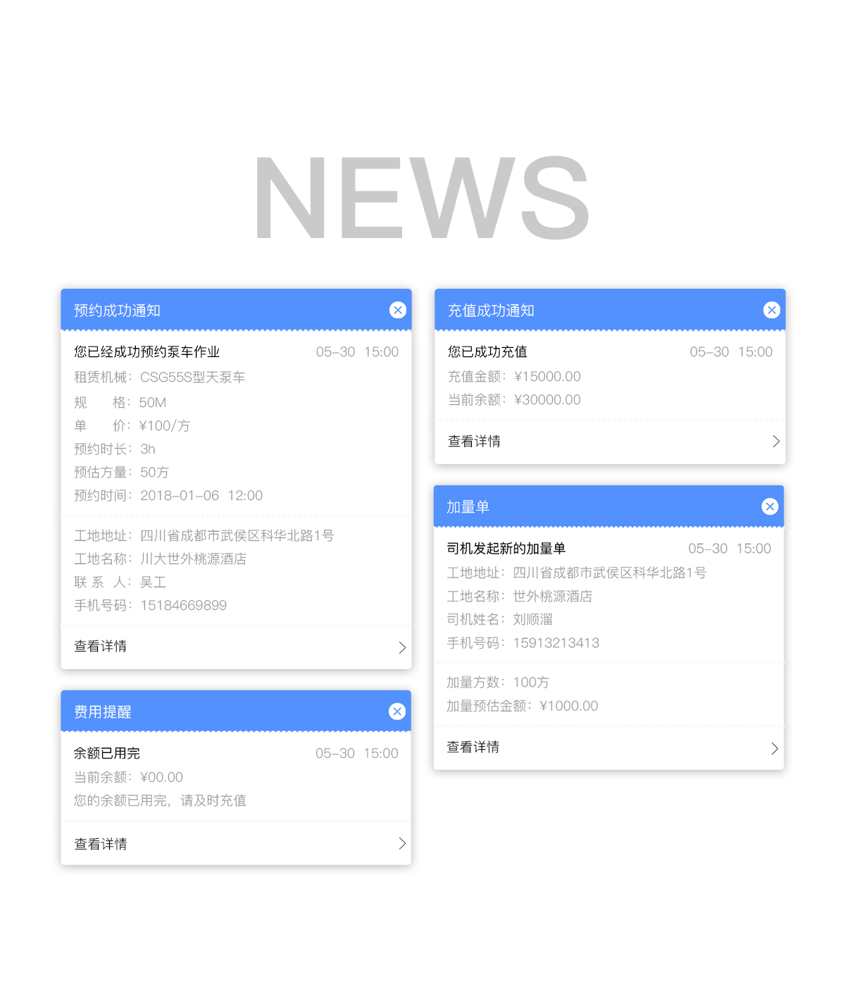 后台分配司机:用户预约泵车后,后台可以以地图形式展现工地位置、附近司机位置,并且可以选择几个司机分配给这个订单。