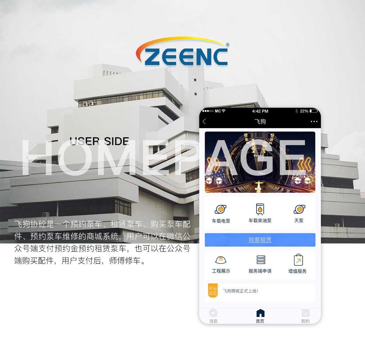 飞狗协砼是一个预约泵车、租赁泵车、购买泵车配件、预约泵车维修的商城系统,用户可以在微信公众号端支付预约金预约租赁泵车,后台分配司机,司机在司机端APP中看自己的任务,可以一键导航到公司并且施工;用户也可以在公众号端购买配件,后台发货,或者预约维修,后台分配师傅当场报价,用户支付后,师傅修车。