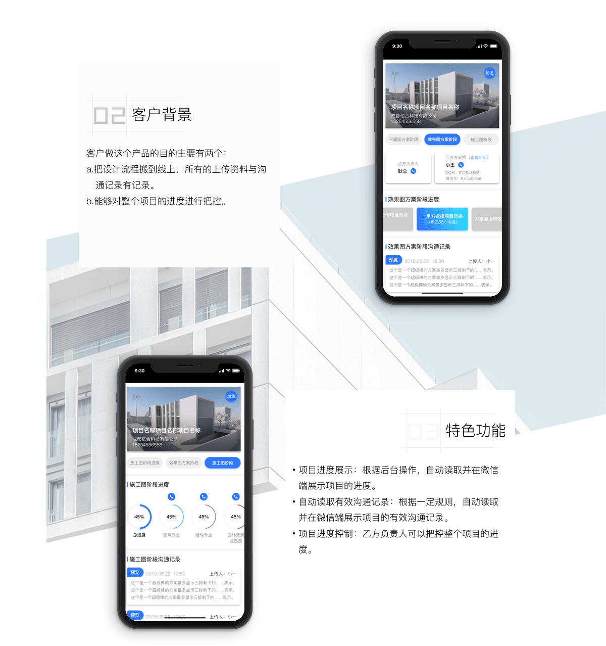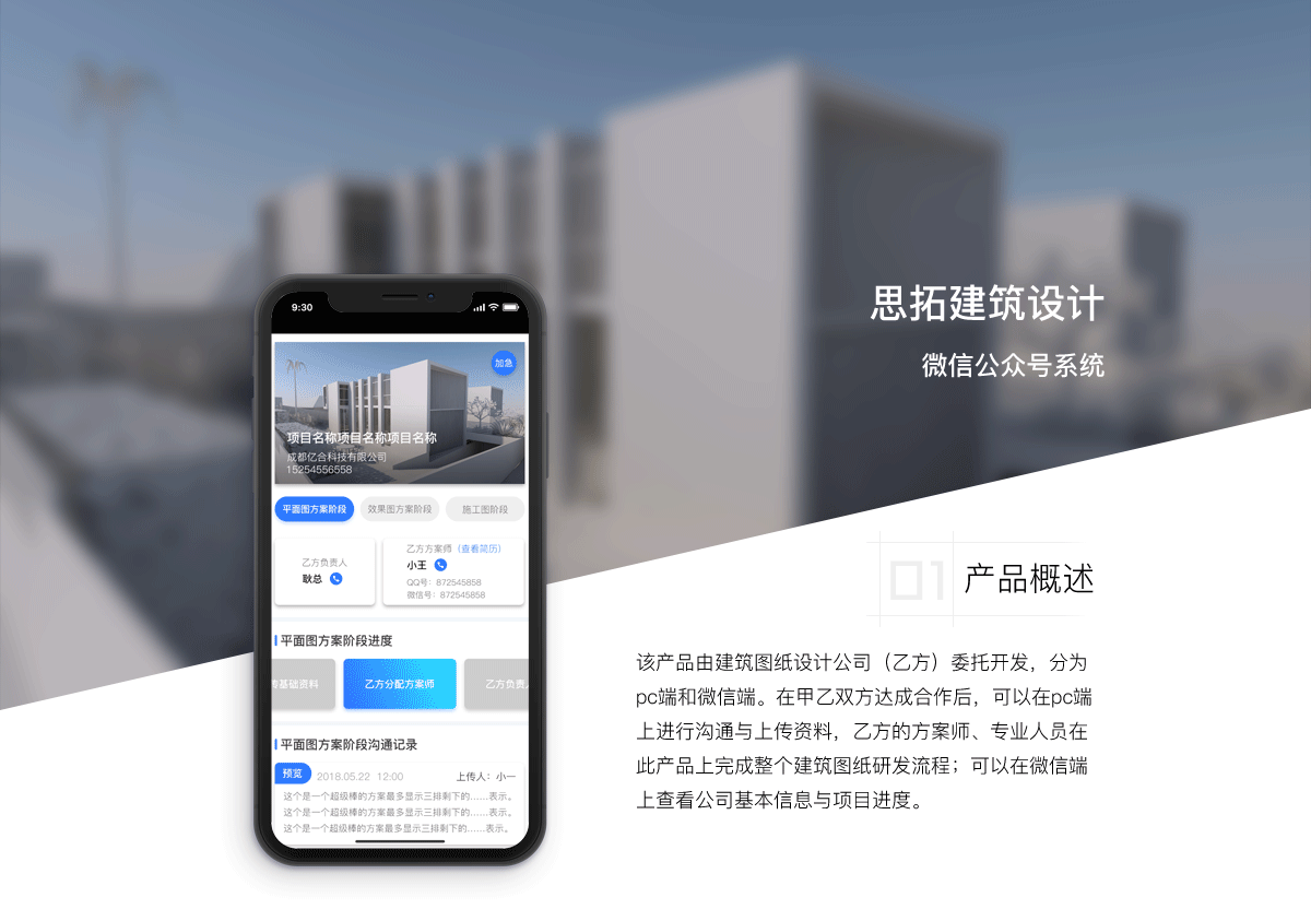 该产品由建筑图纸设计公司(乙方)委托开发,分为pc端和微信端。在甲乙双方达成合作后,可以在pc端上进行沟通与上传资料,乙方的方案师、专业人员在此产品上完成整个建筑图纸研发流程;可以在微信端上查看公司基本信息与项目进度。