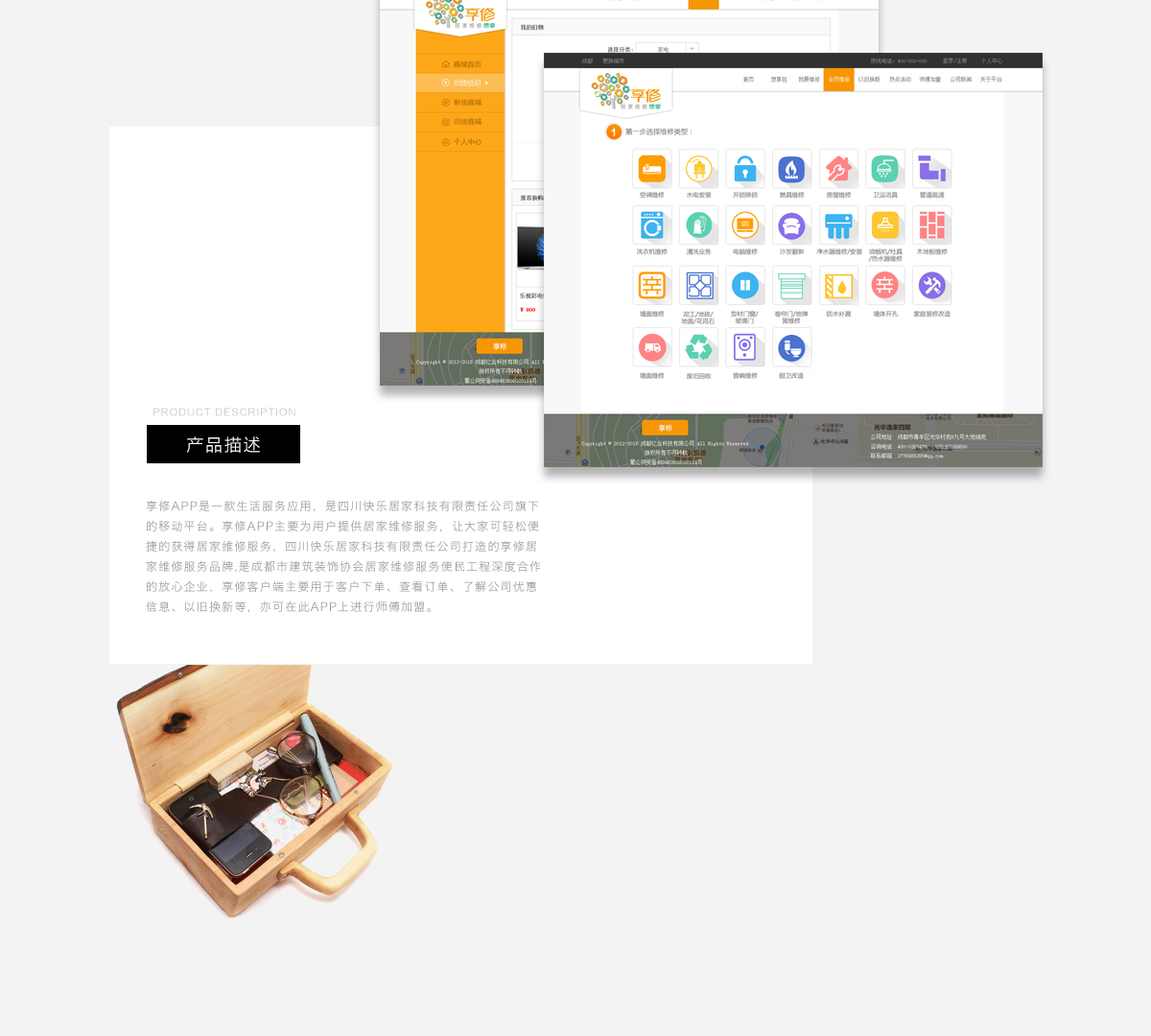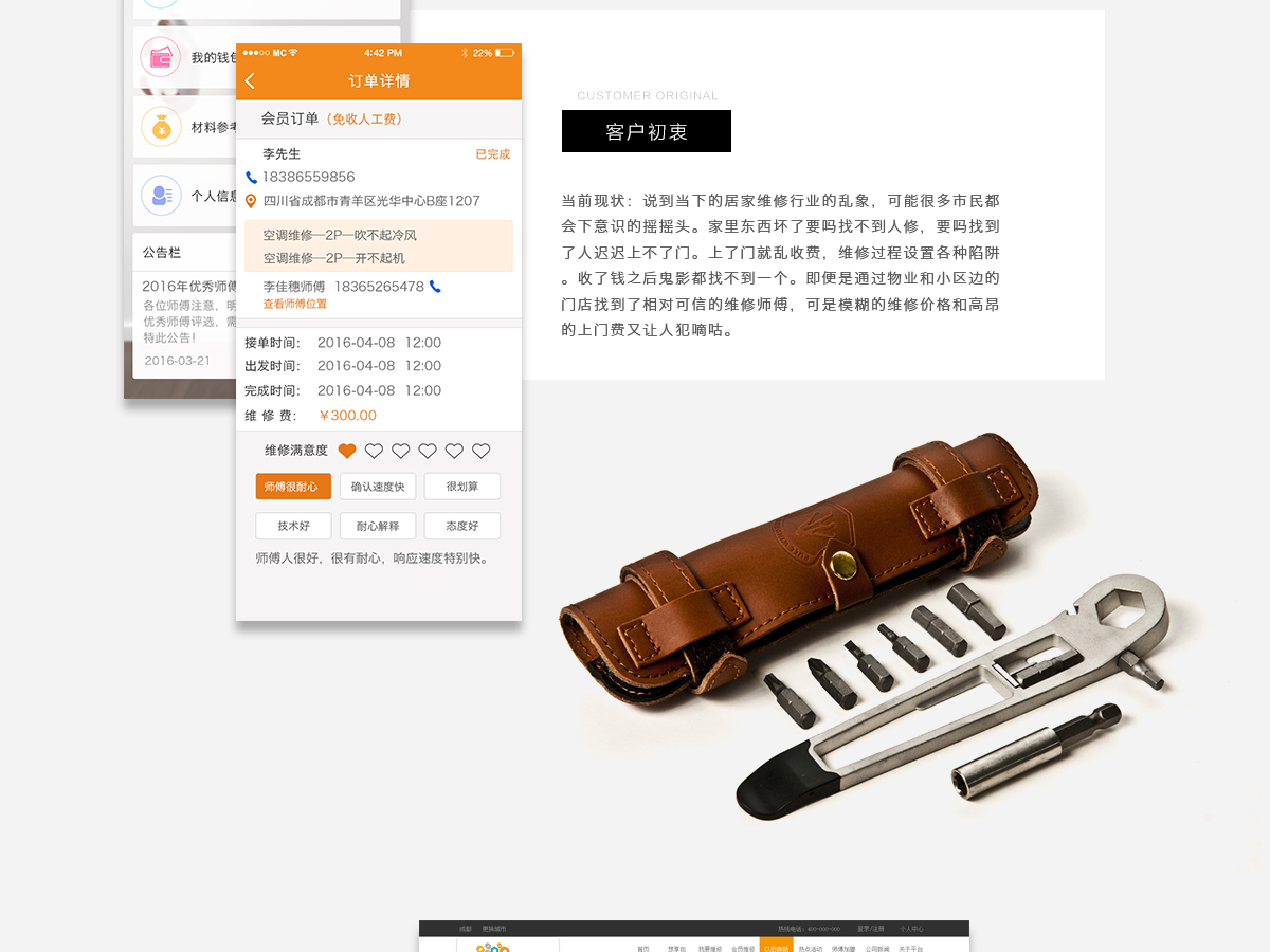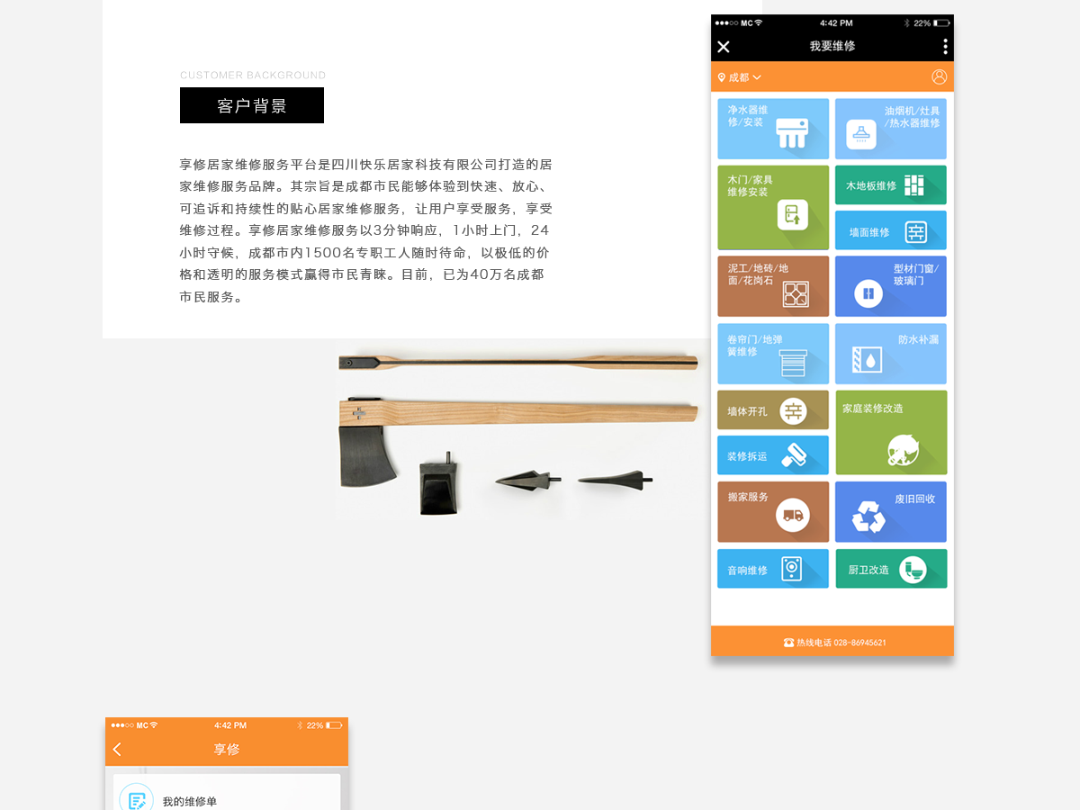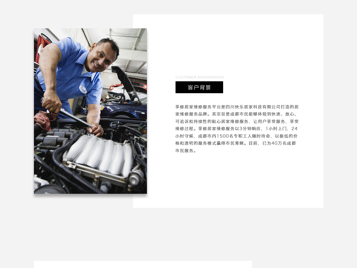 商城统一后台管理后台,多管理员,多角色登录管理,享修app分为两个类型端口:师傅端和用户端,一端整合闲散的维修师傅,一端对接家庭维修的需求。
