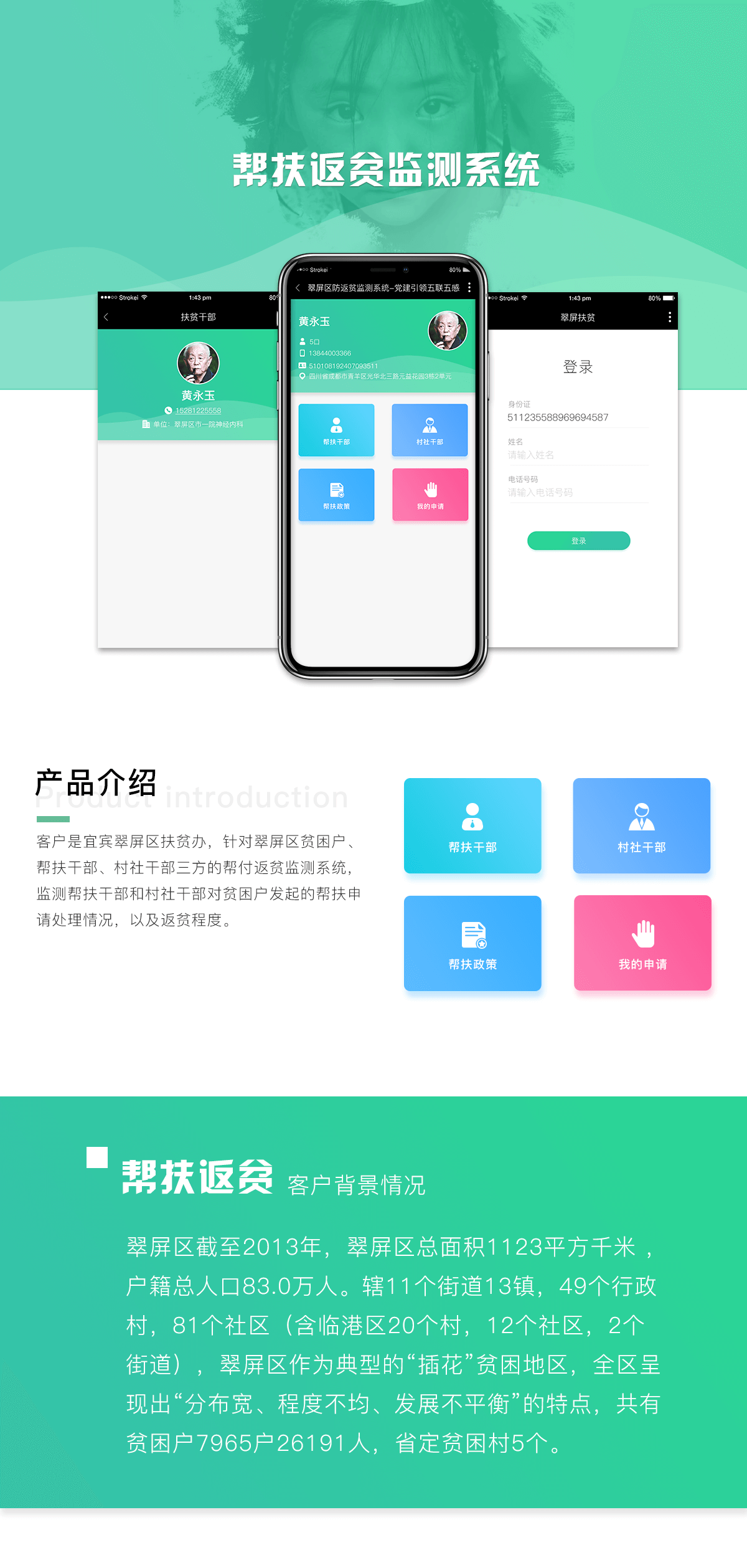 宜宾翠屏区扶贫办运营,针对翠屏区贫困户、帮扶干部、村社干部三方的帮付返贫监测系统,监测帮扶干部和村社干部对贫困户发起的帮扶申请处理情况,以及返贫程度。